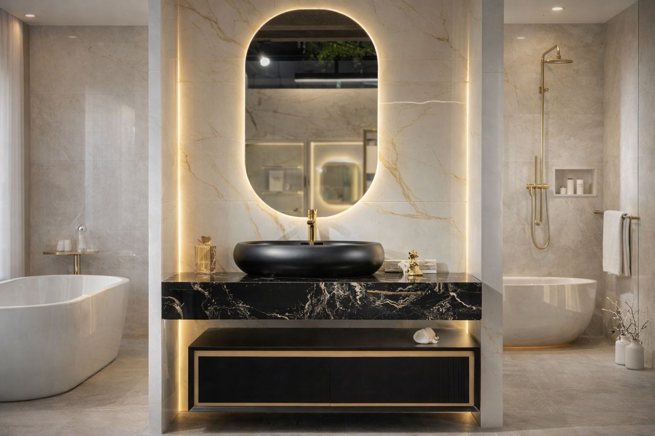 Led mirror+Rock Slab+ 2 Ceramic basin+Cabinet